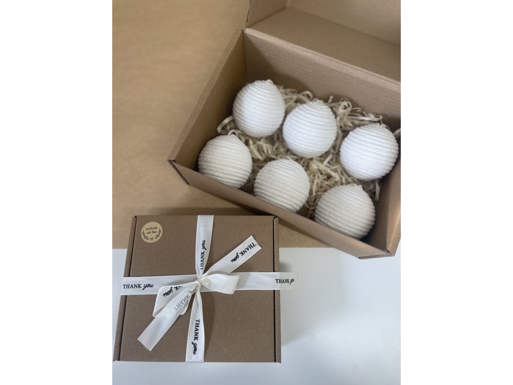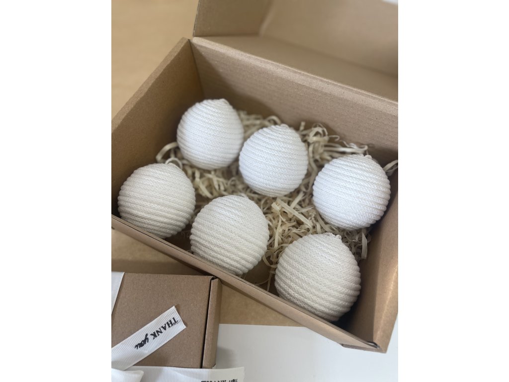 Každá guľa je ručne vyrobená z recyklovanej bavlny a polystyrénovej gule, ľahučká a odolná, vhodná pre rodiny s deťmi aj domácnosti so zvieratkami.